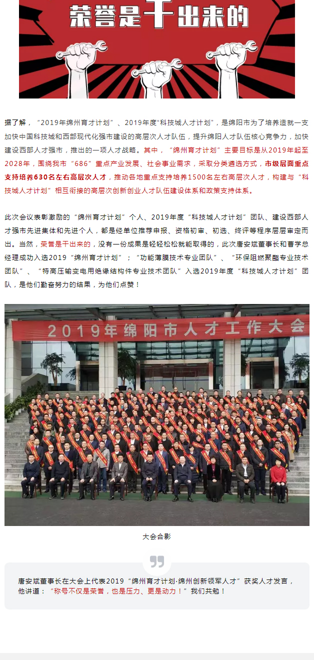 12月10日,绵阳市市委组织部等12部门联合发布《关于印发2019年“绵州育才计划”入选者名单的通知》(绵组通〔2019〕78号),公示了14类125名入选者名单,公司董事长唐安斌成功入选2019“绵州育才计划·绵州创新领军人才”, 总经理曹学成功入选2019年“绵州育才计划·绵州企业管理菁英”。